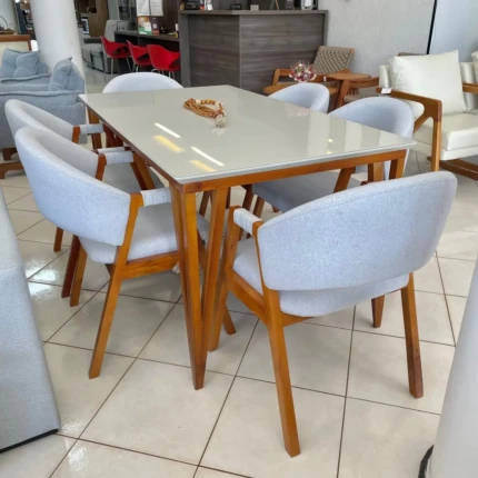 Mesa 1,60m com Vidro Rubi (4683) com 6 Cadeiras Relax Linho (2060)