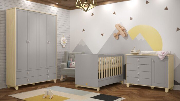 Um Lindo e Moderno Quarto de Bebê 100% MDF composto de 3 peças: Roupeiro, Cômoda e Berço.