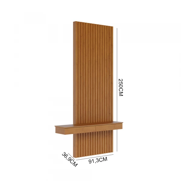 Painel Ripado ALTO – de 2,50m de altura – com aparador 02 gavetas, puxador invisivel, todo na cor madeirado Nature, nessa versão com um Espelho Moderno e elegante, com alça preto e suporte.
