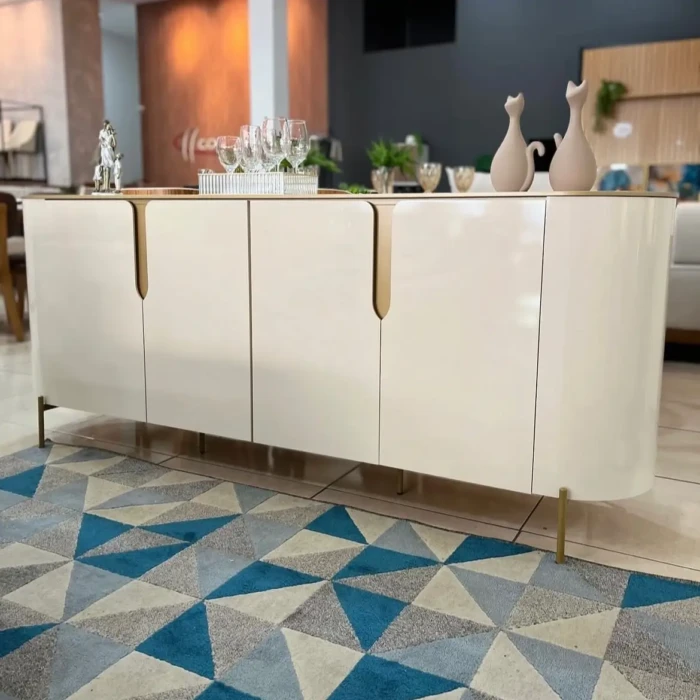 Maravilhoso Balcão buffet com 04 portas para quem ama um design moderno e tons claros, com um design moderno e sofisticado, fazendo uso de cantos arredondados para trazer mais