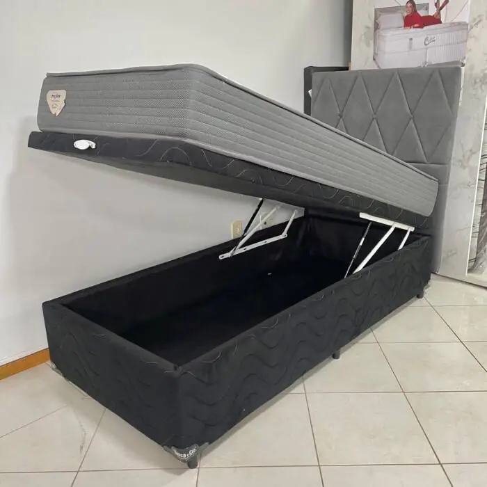 Possui 2 Pistões para abrir a Tampa e você poder otimizar o espaço do seu quarto, guardando de tudo nesse imenso espaço da base