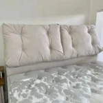 Uma cabeceira elegante, com detalhe de 2 botões, revestida toda em tecido linho.