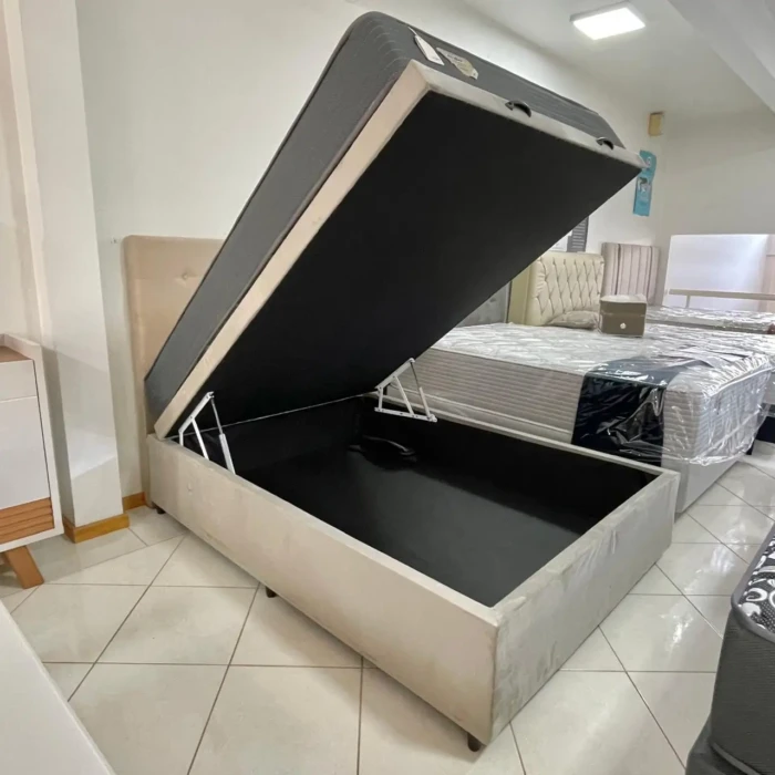 Possui 2 Pistões para abrir a Tampa e você poder otimizar o espaço do seu quarto, guardando de tudo nesse imenso espaço da base