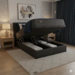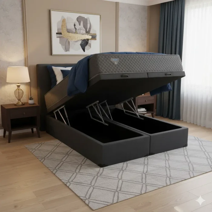Possui 2 Pistões para abrir a Tampa e você poder otimizar o espaço do seu quarto, guardando de tudo nesse imenso espaço da base