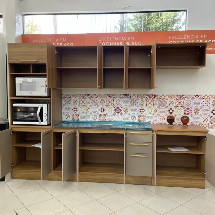 A Cozinha Completa Modulada Botanic da Kappesberg veio para trazer leveza e sofisticação à sua casa. Com detalhes na cor nogueira e fendi, dobradiças com sistema de amortecimento e estrutura produzida em MDF/MDP de 15mm, a linha Botanic traz um ótimo aproveitamento interno e externo do espaço e torna o ambiente mais aconchegante para você viver os seus momentos.