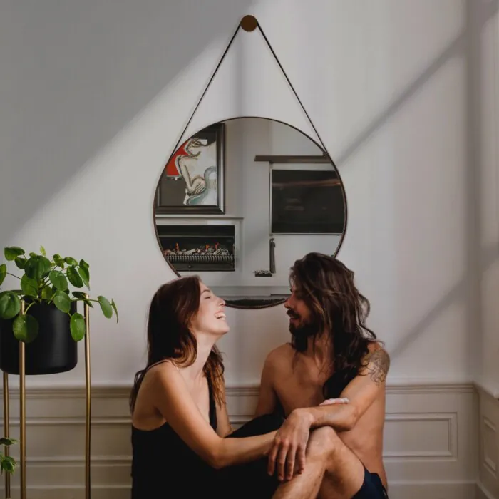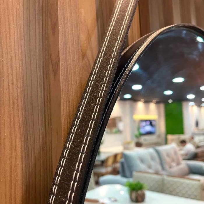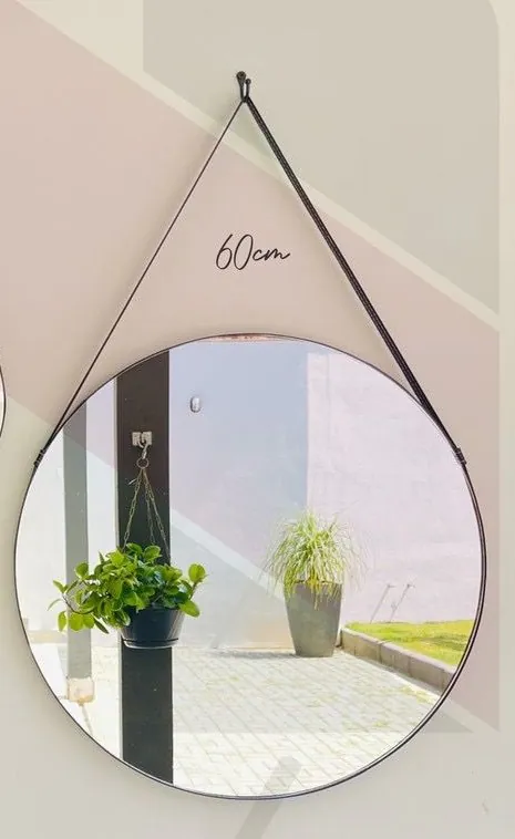 Espelho decorativo com alça em couro sintético PRETO e suporte para parede em Madeira Redondo