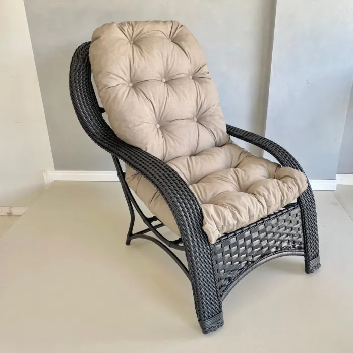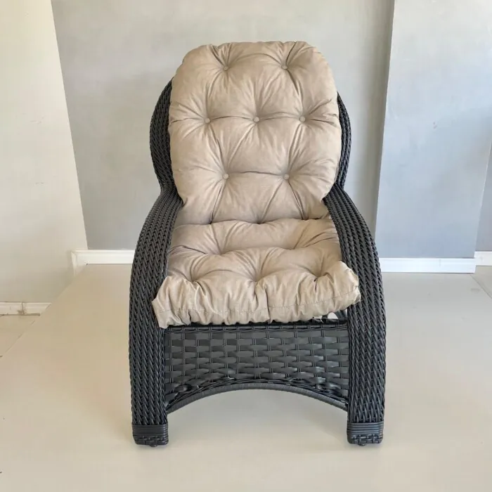 com Pé duplo e almofada solta que pega toda a parte do assento e encosto, revestida de tecido impermeável