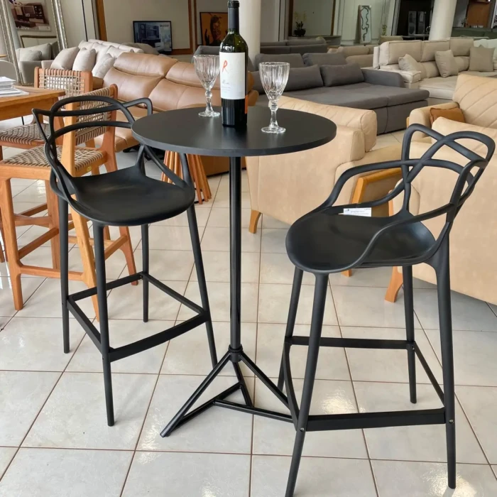 Mesa Bistro com base piramidal de metal e tampo redondo preto + 02 Banquetas Allegra preto