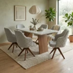 Conjunto de Mesa compacto com 04 Cadeiras em Madeira Maciça, assento estofado no Couro Ecológico claro
