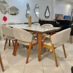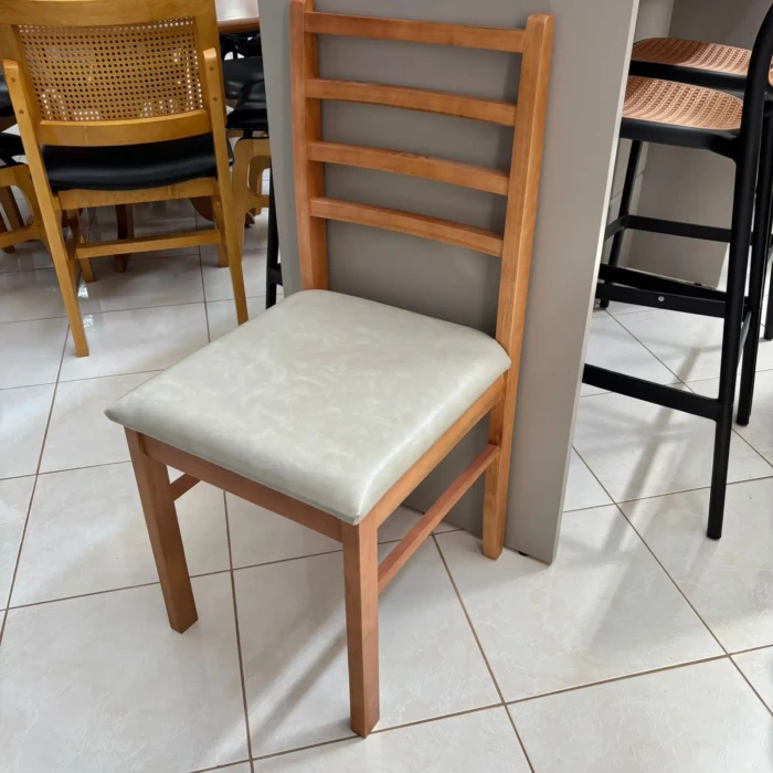 Com 4 Cadeira ergonômicas Beatriz, fabricadas em madeira, com assento em Facto Impermeável Fendi e encosto ripado levemente arredondado.