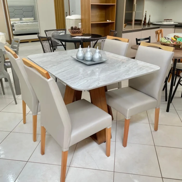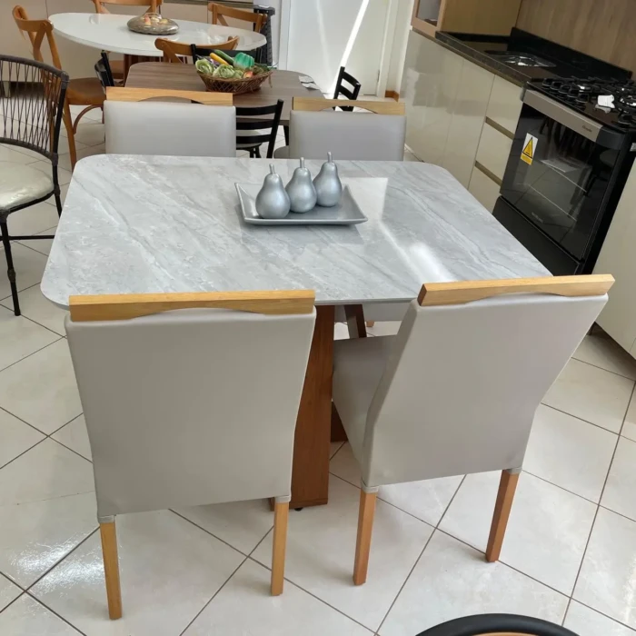 Minimalismo moderno dessa Mesa com tampo Quartzo e 04 Cadeiras em Madeira e tecido Impermeavel