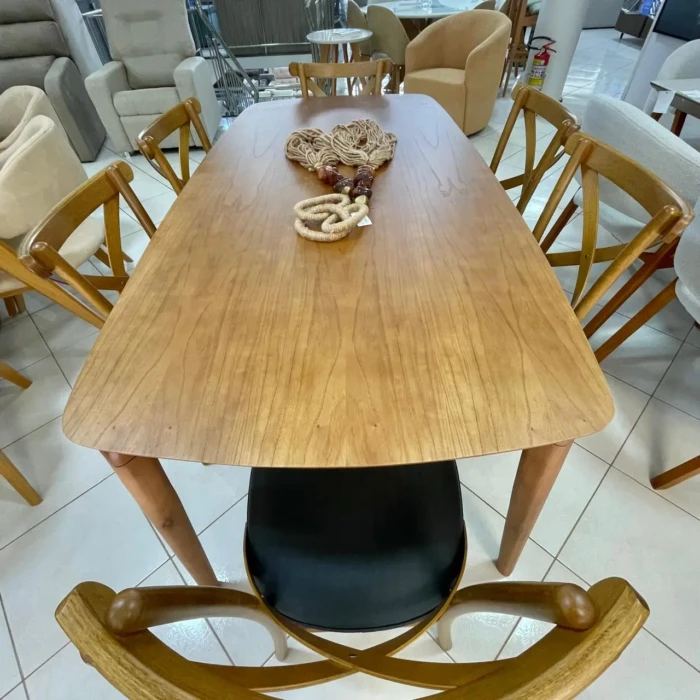 A Mesa Arizona possui pés em Madeira maciça e tampo laminado de cinamomo, combinando com as Cadeiras X