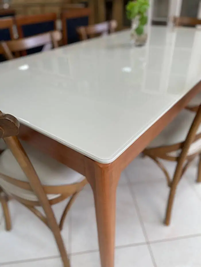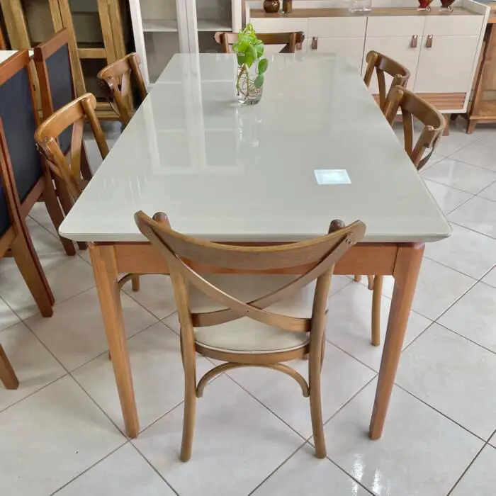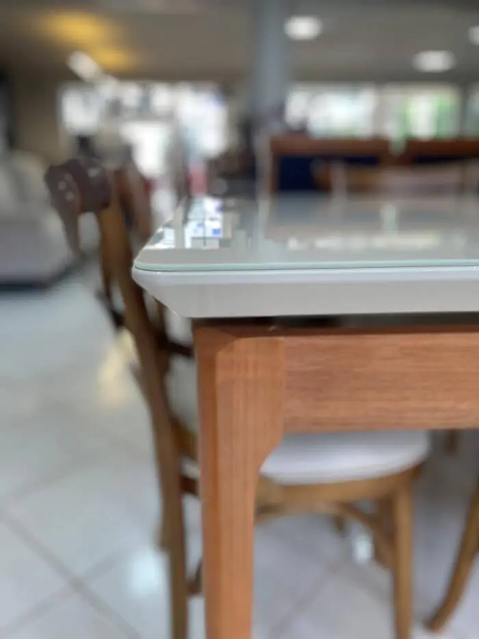 A mesa possui tampo de vidro e pés em madeira maciça, ela é simples de harmonizar com os outros móveis essenciais ao ambiente e oferece um ótimo reforço quando precisar dispor pratos, talheres e copos para acolher a todos com bastante receptividade.
