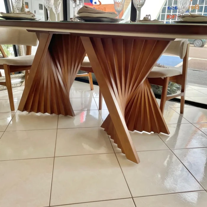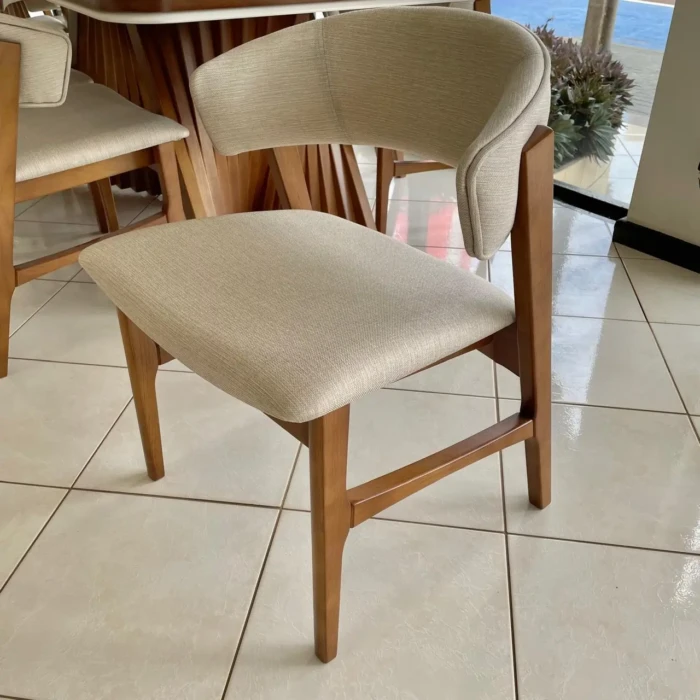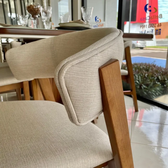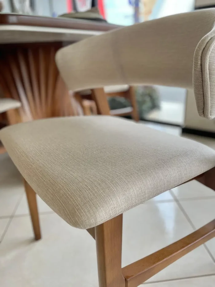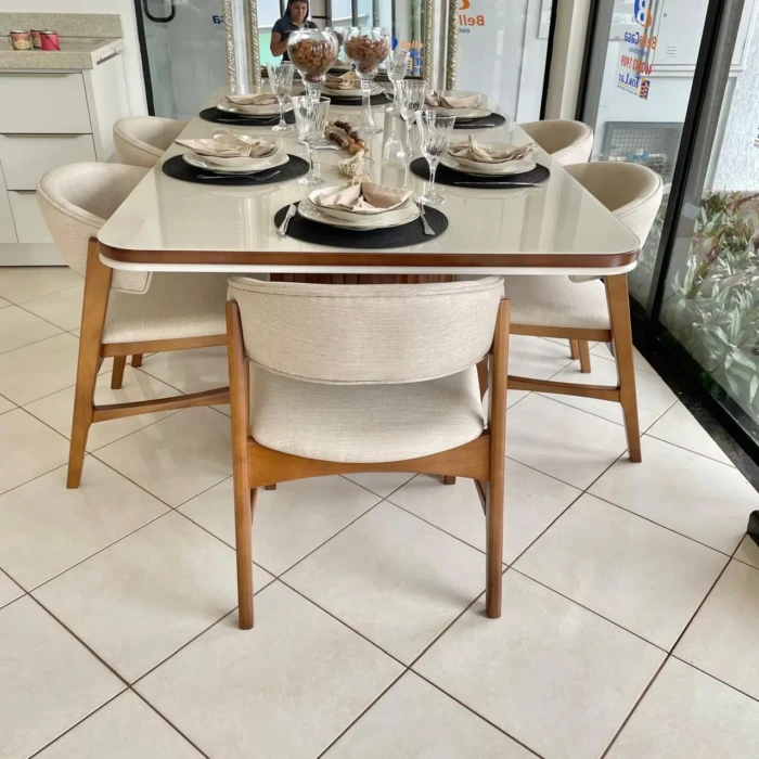 – Com 06 Cadeiras Dior: Combinação de elegância e conforto em um design contemporâneo. Produzida em madeira maciça de tauari, com acabamento sofisticado e estofado de alta qualidade. Ideal para ambientes refinados e projetos de alto padrão. Revestida de tecido Linho e encosto anatômico, projetado para acomodar a curvatura das costas com leveza e ergonomia, resultando em uma peça funcional e elegante, que se adapta com facilidade a diferentes estilos de decoração.
