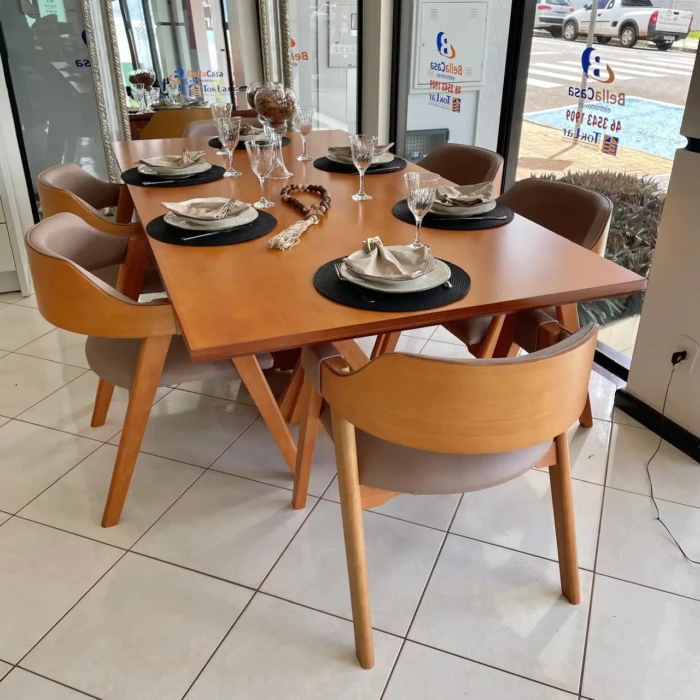 Com predominância da madeira, os detalhes da base ripada em onda são um charme a parte. As cadeiras em tecido IMPERMEÁVEL trazem facilidade para limpeza e manuntencação.