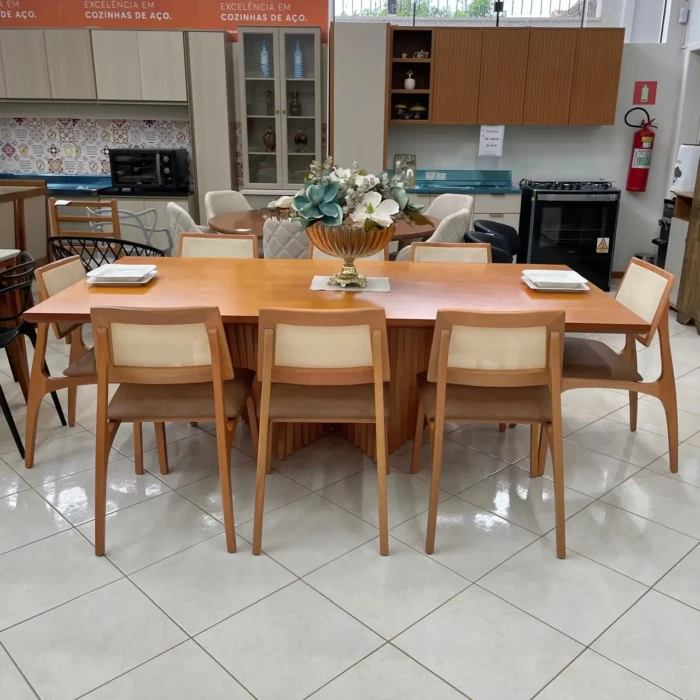 Com predominância da madeira, os detalhes da base ripada em onda são um charme a parte. As cadeiras em tecido IMPERMEÁVEL trazem facilidade para limpeza e manutenção.