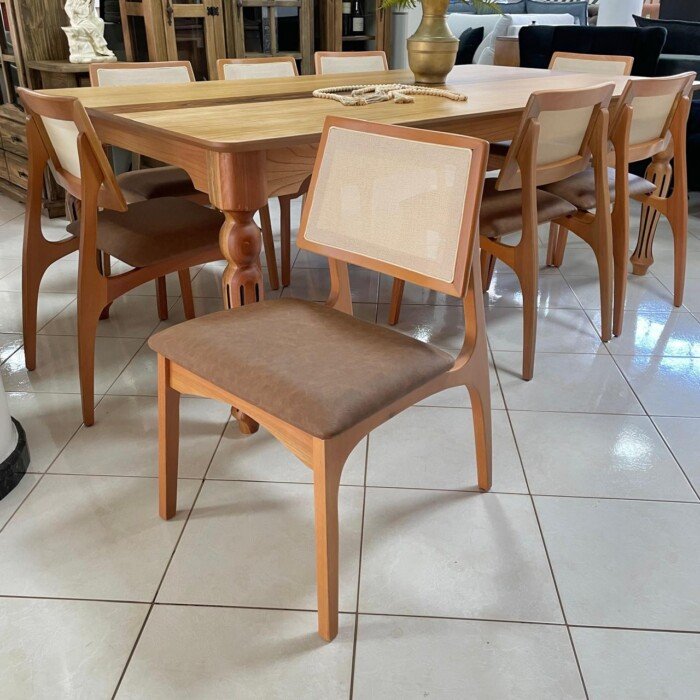 – Com 8 Cadeira em Madeira Romana: Design moderno, com assento estofado revestido de couro ecologico marrom e encosto em tela sintética. Fabricada em madeira robusta, com reforço extra na parte inferior do assento, que garanta um visual cheio de requinte sem abrir mão da durabilidade.