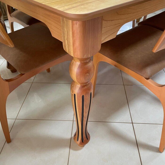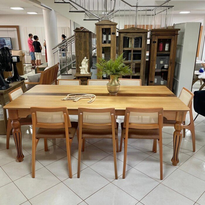 Você vai se surpreender com essa Maravilhosa Mesa Isabela com Pés Torneados, em verniz amendoa com detalhe de madeira Pau Ferro no tampo