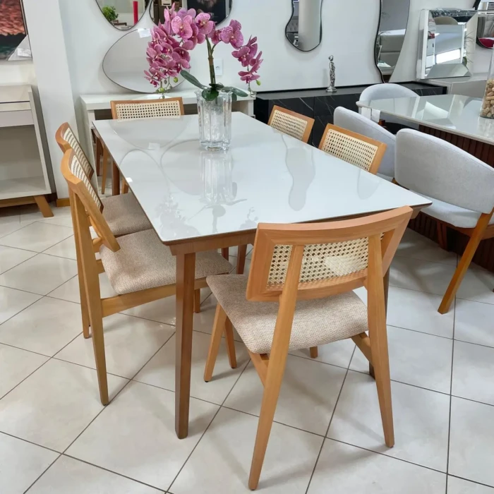 Mesa 1,80m Vidro Off Larissa (991) com 6 Cadeiras Ayla com Tela Natural (2818)