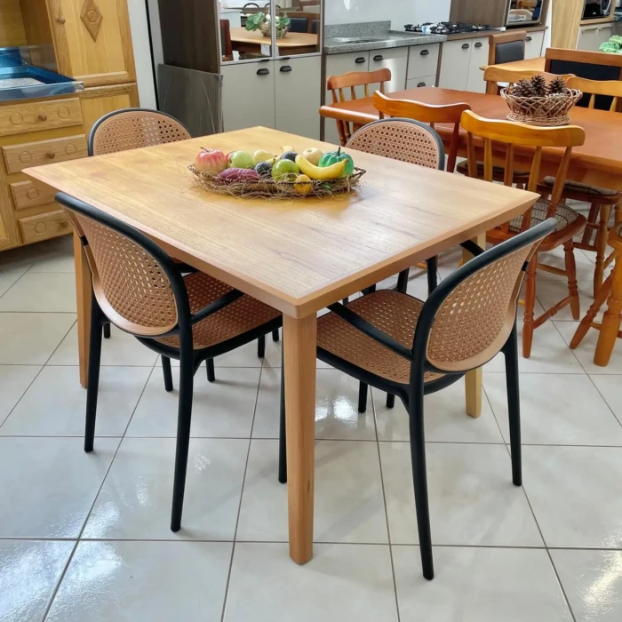 Linnda Mesa com Pés em Madeira e tampo Avelã, que fazem uma maravilhosa combinação com 4 Cadeiras com Braço