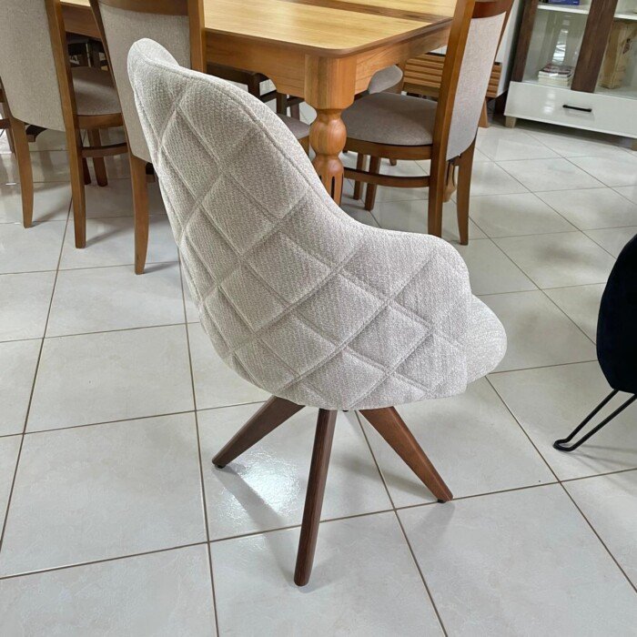Com 06 Cadeiras Giratorias Leia: Pés de madeira maciça e tecido boucle, que traz o aconchego do toque macio do boucle pra você sentar se acomodar bem.