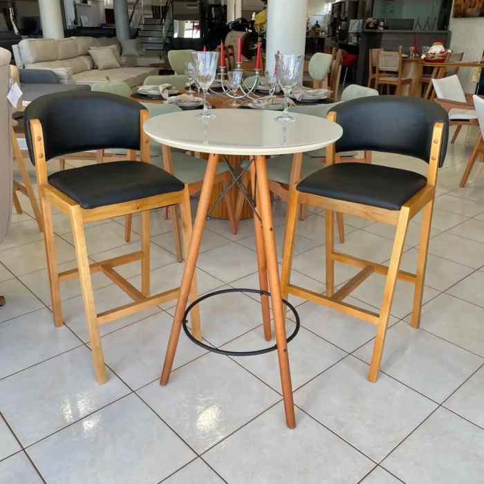A Mesa Bistro Gourmet tem vidro Off White colado que tras sofisitcação e requinte pro ambiente, combinado com 02 banquetas super aconchegantes em madeira.