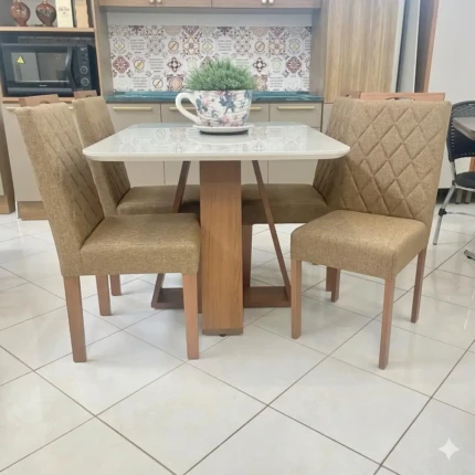 – Com 08 Cadeiras Alta em Madeira, ergonômica, com encosto e assento estofado num lindo tecido linho, prático pra limpar.