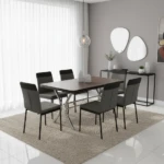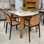 Minimalismo moderno dessa Mesa com tampo Quartzo e 06 confortaveis Cadeiras com Linho e Encosto Tela