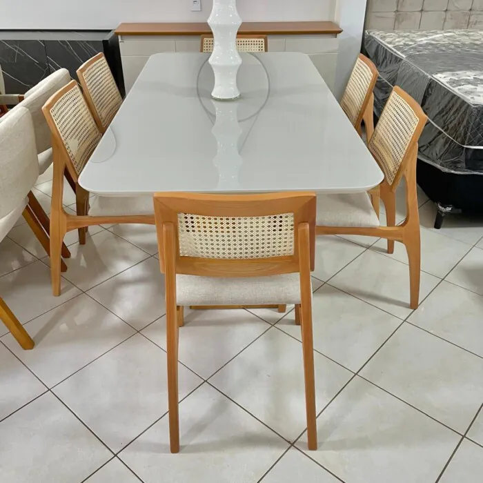 Mesa Dala 1,80m vidro Off White (4342) com 6 Cadeiras Romana em Tela Natural (2217)