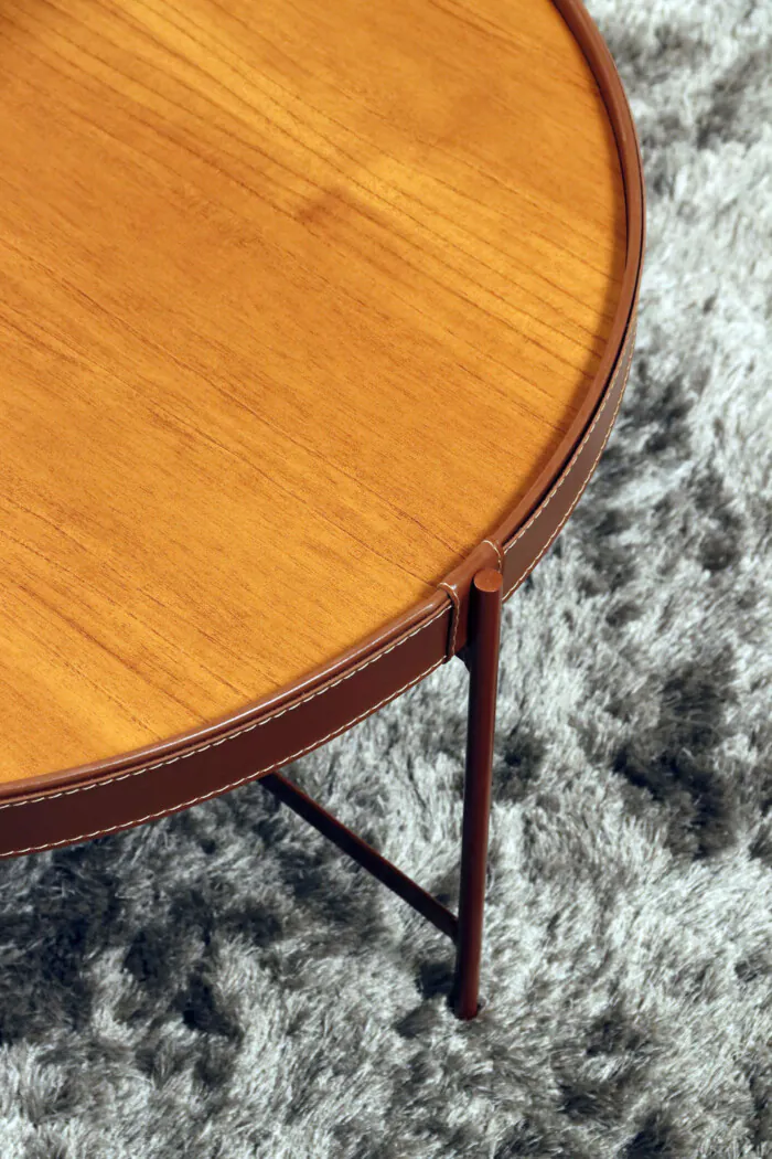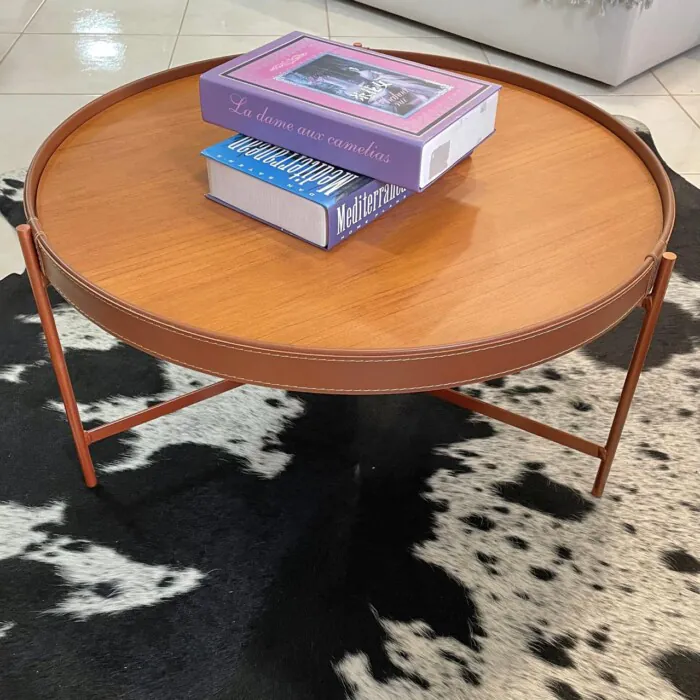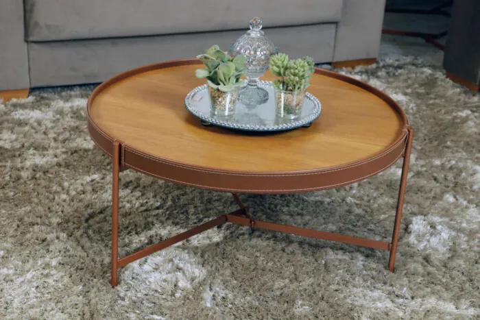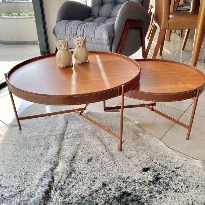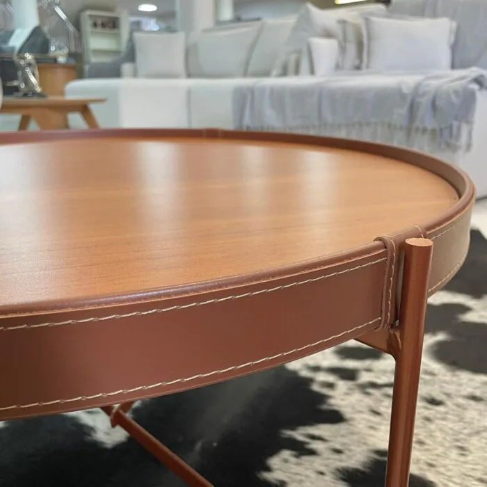 Mesa de Centro com pés em Metal Cobre, tampo redondo com parte interna madeirado Nature
