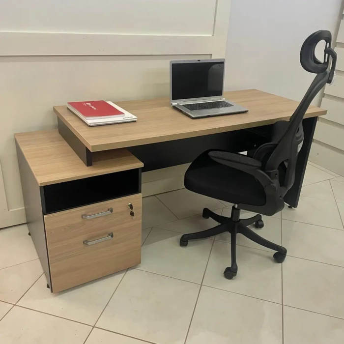 Mesa de escritório com design funcional, ideal para ambientes de trabalho ou estudo. Possui amplo tampo para melhor aproveitamento do espaço, gavetas para organização de documentos e objetos, além de nicho auxiliar que traz mais praticidade para a rotina diária.