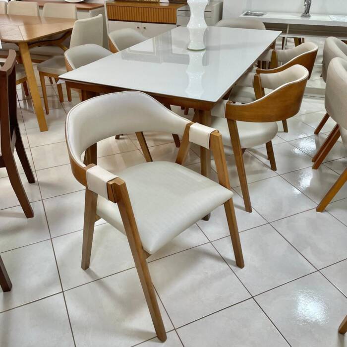 – Com 6 Cadeiras Rubia: A Sensação do momento: com Braços em Madeira, design e Sofisticação retratados com perfeição nessa cadeira. Tecido Facto Impermeável Pérola.