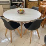 – Com 08 Cadeiras Alta em Madeira, ergonômica, com encosto e assento estofado num lindo tecido linho, prático pra limpar.
