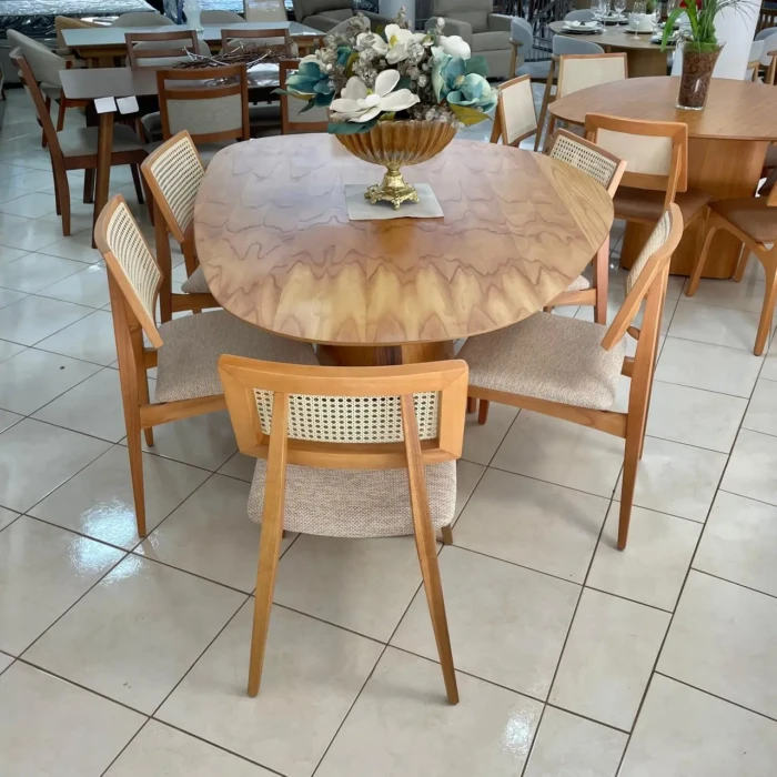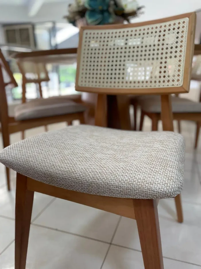 – Com 6 Cadeira em Madeira Ayla: Design moderno, com assento estofado revestido de tecido linho e encosto em tela natural. Fabricada em madeira robusta, com reforço extra na parte inferior do assento, que garanta um visual cheio de requinte sem abrir mão da durabilidade.