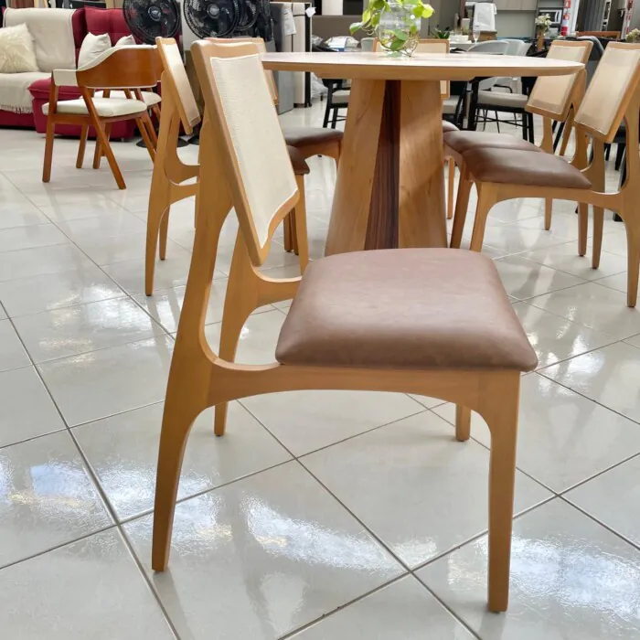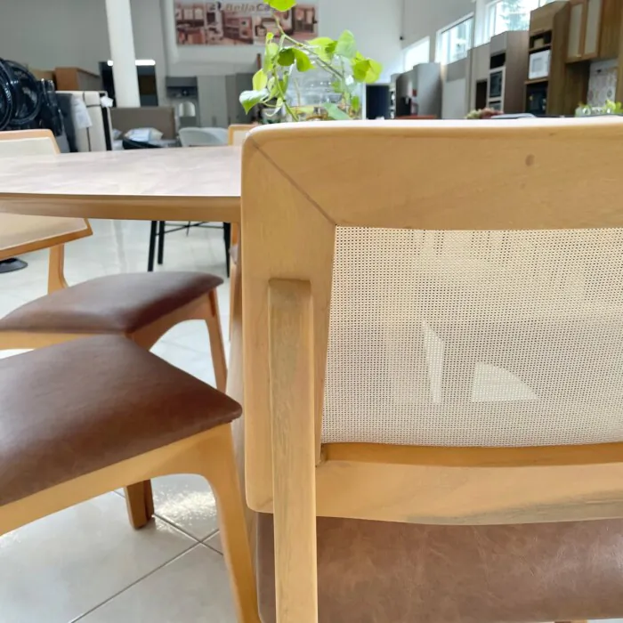 – Com 6 Cadeira em Madeira Romana: Design moderno, com assento estofado revestido de couro ecologico marrom e encosto em tela sintética. Fabricada em madeira robusta, com reforço extra na parte inferior do assento, que garanta um visual cheio de requinte sem abrir mão da durabilidade.