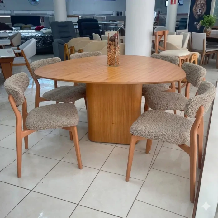 – Com 6 Cadeiras em Madeira Venus: a escolha perfeita para quem valoriza conforto, durabilidade e um design elegante. Fabricada em madeira maciça de eucalipto, destaca-se pela resistência e acabamento refinado, ideal para compor salas de jantar. Revestide de Tecido Boucle