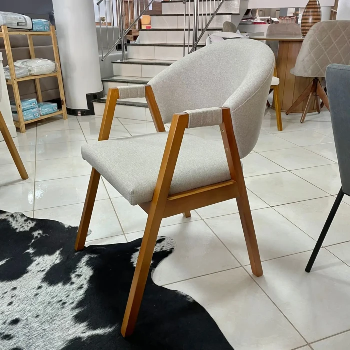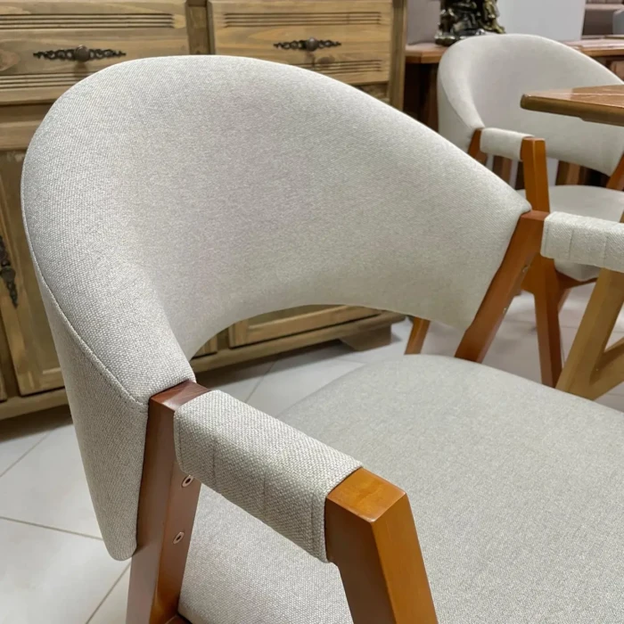 Com 4 Cadeiras em Madeira Suellen Dora: Design e Sofisticação retratados com perfeição nessa cadeira, que possui Braço com detalhe revestido em tecido linho.