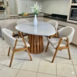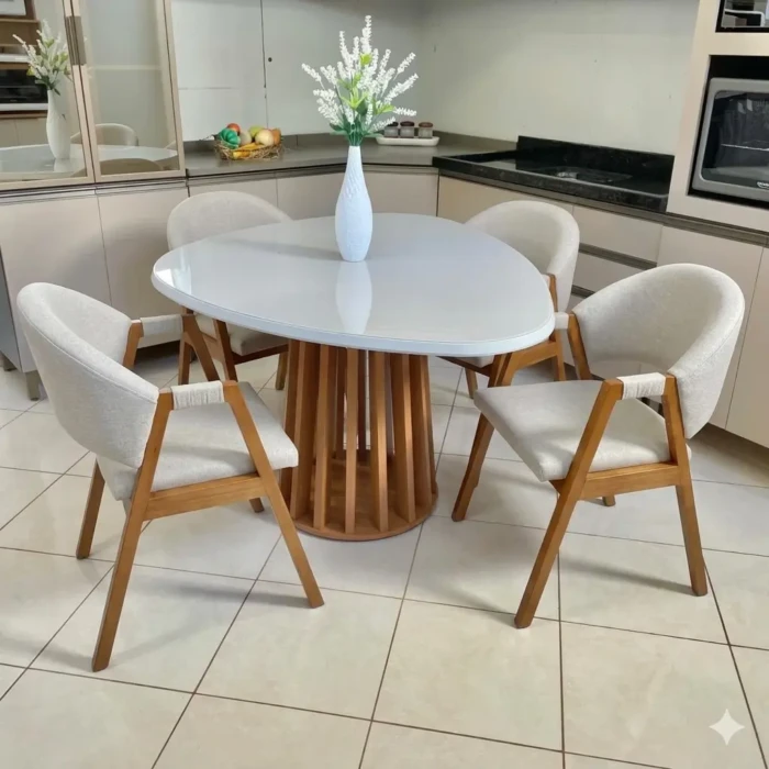 Mesa com pé ripado de mdf freijo e tampo Organico com vidro Off White: Modernidade e linhas naturais para sua cozinha,