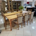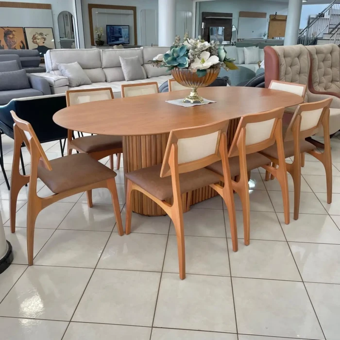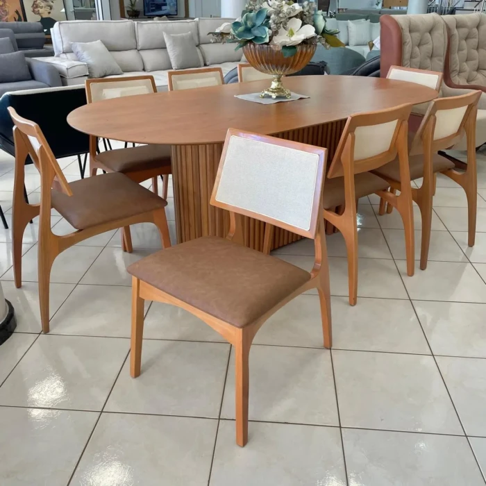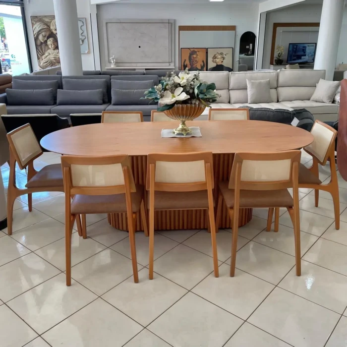 A Base ripada em Madeira de Cinamomo curvo é protagonista, e as cadeiras robustas e em madeira aumentam a durabilidade do seu produto