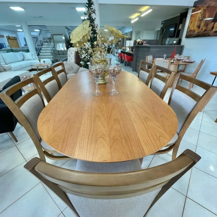 Mesa Oval 2,20m Ripada Cinamomo (2729) com 8 Cadeiras Vitoria Linho (2081)