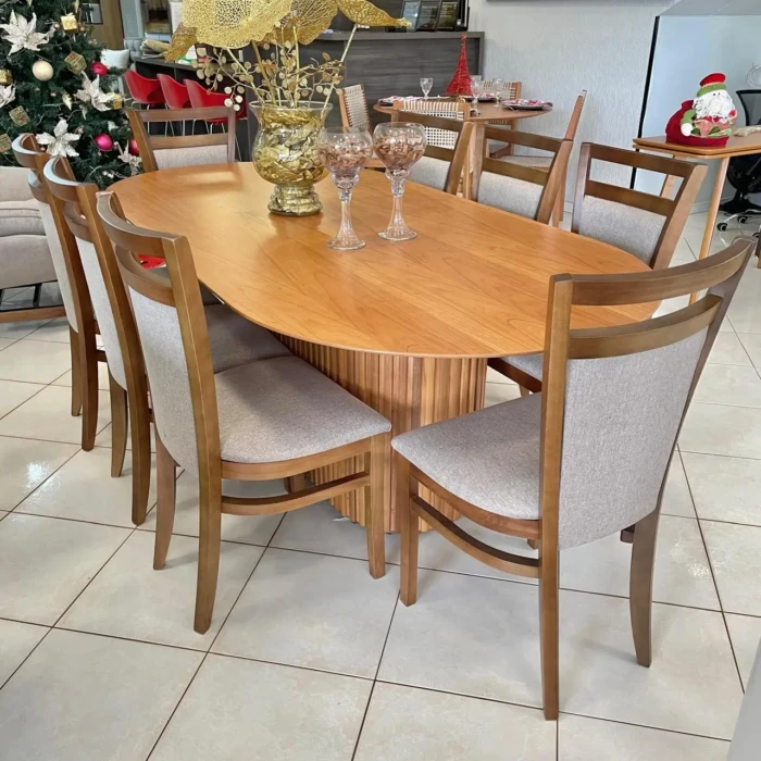 A Base ripada em Madeira de Cinamomo curvo é protagonista, e as cadeiras robustas e em madeira aumentam a durabilidade do seu produto