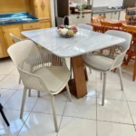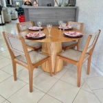 A Base ripada em Madeira de Cinamomo curvo é protagonista, e as cadeiras robustas e em madeira aumentam a durabilidade do seu produto