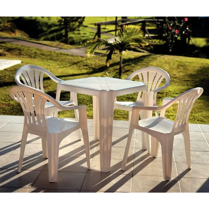 Jogo de 1 Mesa com 4 Cadeiras de Plástico de excelente acabamento e durabilidade, versátil para ser utilizado à beira da praia, piscina, camping e varandas.