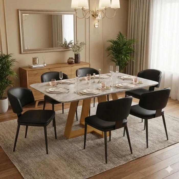 Minimalismo moderno dessa Mesa com tampo Quartzo e 06 robustas cadeiras Siena Preto