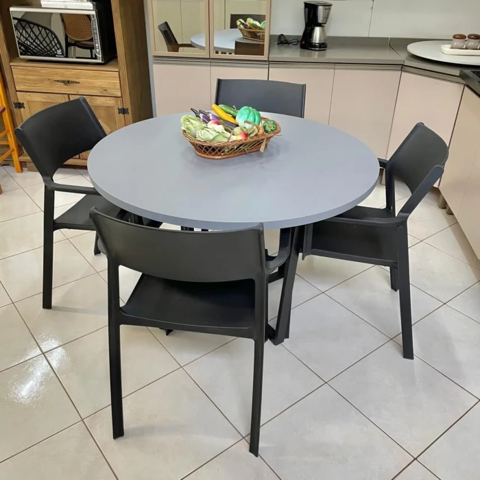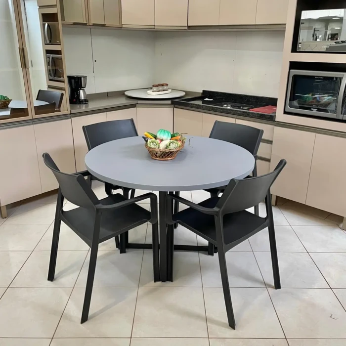 A Mesa Redonda com Pé Trapezio e Tampo Cinza Sagrado, possui sapatas com regulavel que alem de nivelar a mesa tambem protegem de água e umidade.