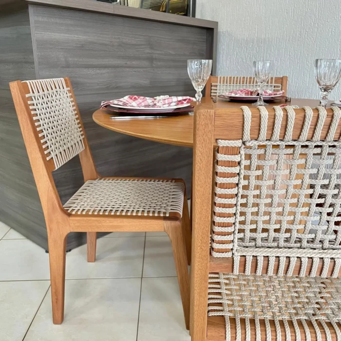 Com 04 Cadeiras Sintra, produzida com madeira de eucalipto reflorestado com acabamento em stain jatobá e corda naútica de 10cm de polipropileno na cor areia
