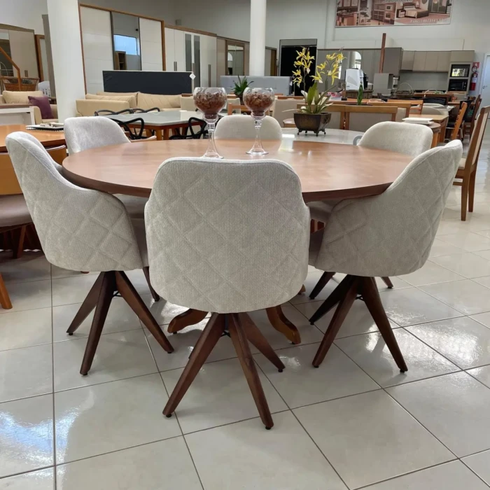 Com 06 Cadeiras Giratorias Leia: Pés de madeira maciça e tecido boucle, que traz o aconchego do toque macio do boucle pra você sentar se acomodar bem.