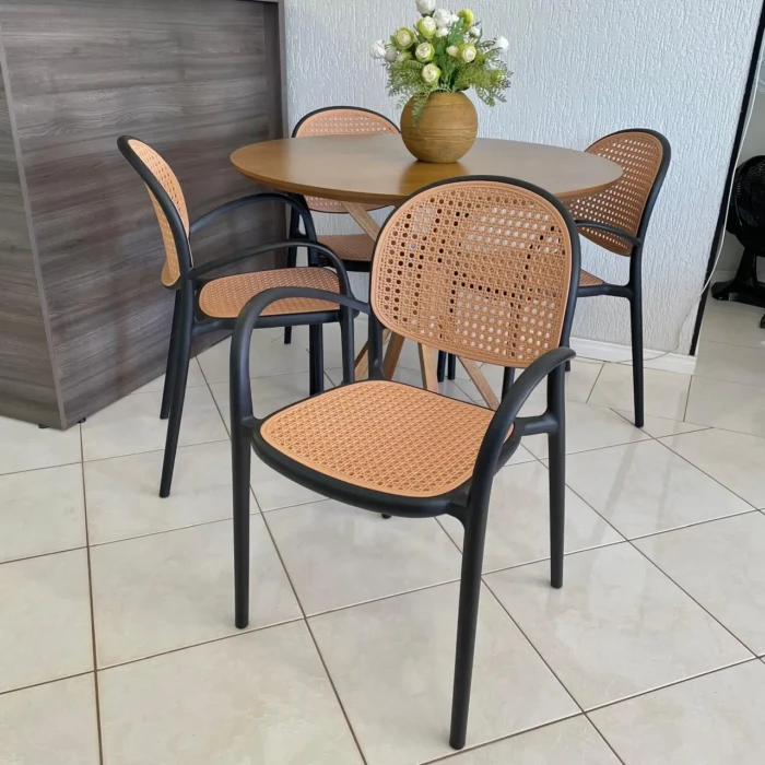 A cadeira Portofino é elegante e moderna, com um encosto e assento que apresentam a textura do rattan. No entanto, sendo feita inteiramente de polipropileno, oferece uma resistência ainda maior.