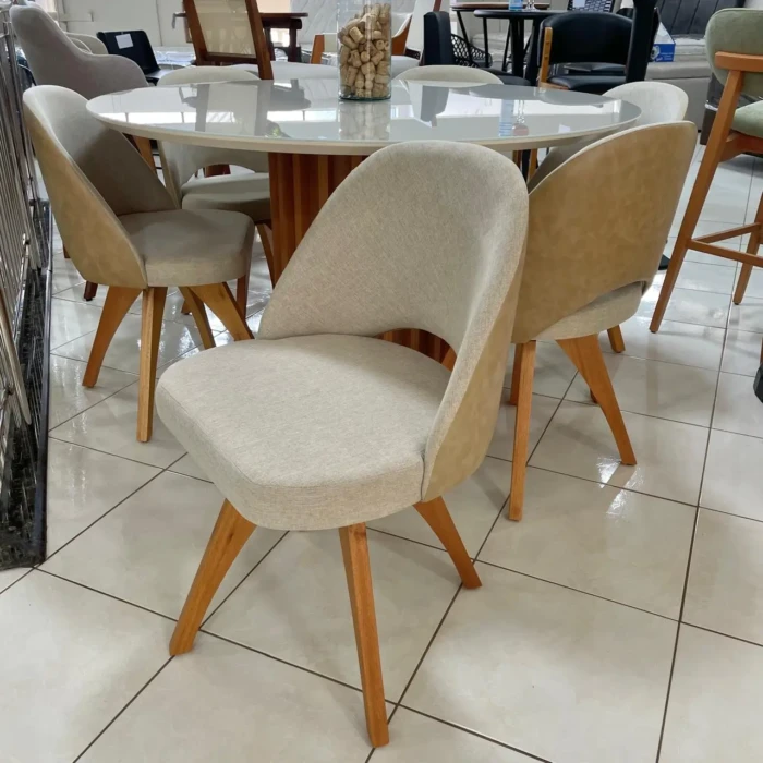 Com 06 Cadeiras Bia: Pés de madeira maciça e tecido composê com costas em couro ecologico e frontal no Linho, que traz o aconchego do toque macio do boucle pra você sentar, com a proteção e robustes da parte da costas do couro para facilitar a limpeza.
