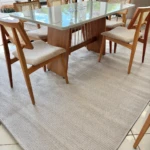 – A Mesa acompanha 04 Cadeiras Chicago, com corda naval preta em todo o encosto e revestindo também o apoio dos braços. O assento é em tecido Fendi impermeavel.